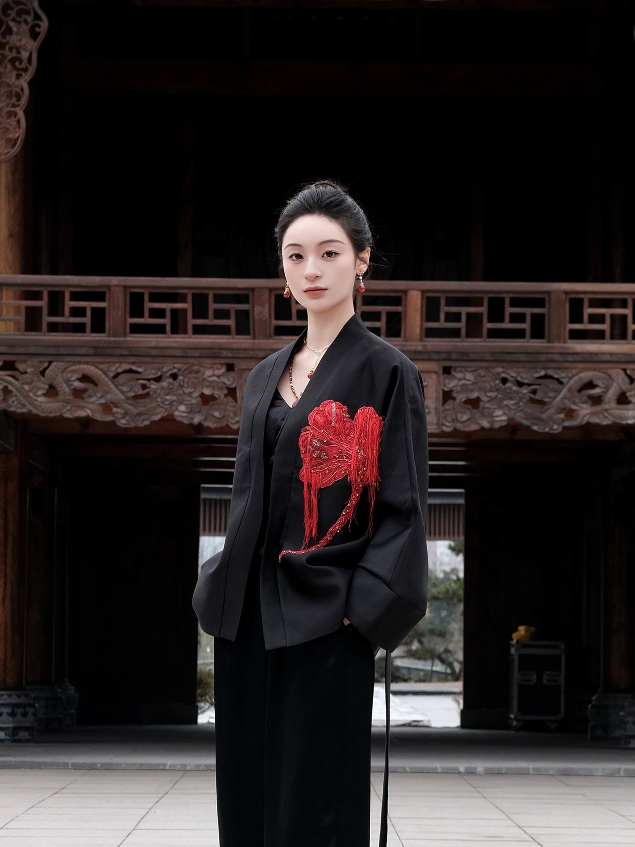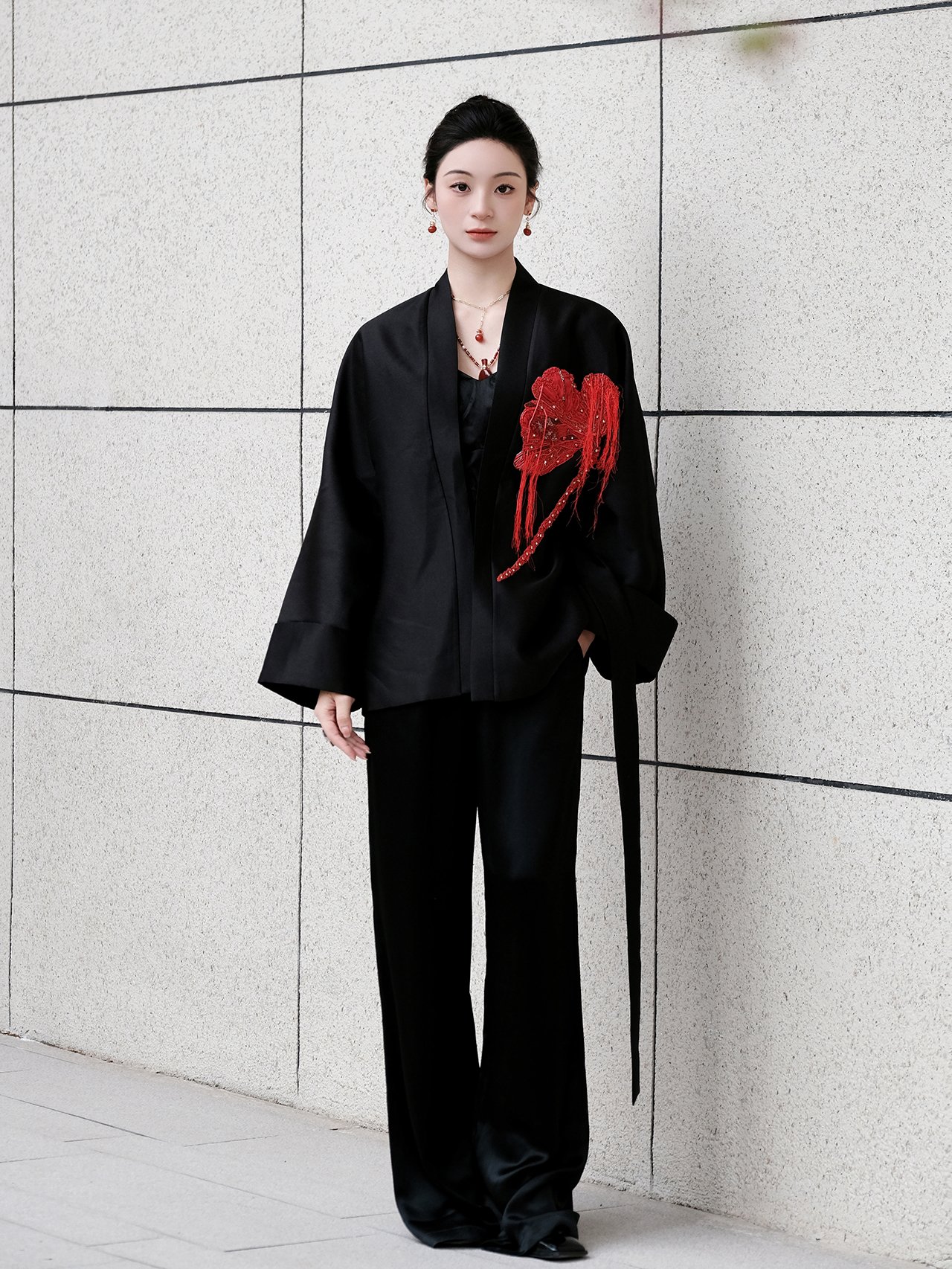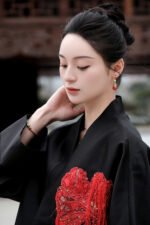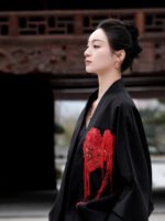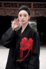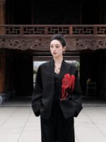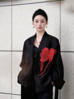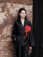 This coat presents a canvas of serene Ink Black, where French-embroidered hibiscus blooms with poetic intensity. It captures a dialogue between Eastern artistic abstraction and Western romantic craftsmanship, defining a modern quiet luxury that speaks to intellectual discernment. The clean, architectural silhouette lends itself to versatile expression: layer it over a minimalist turtleneck for formal occasions, or wear it open with a silk blouse and tailored trousers for cultivated ease. Ideal for academic forums, art openings, and refined social gatherings, it is a garment for those who wear their sophistication with thoughtful subtlety.