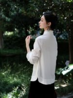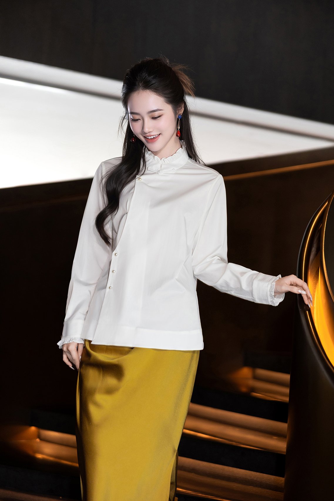 Visually, the piece achieves a state of “quiet refinement.” From afar, it reads as an impeccably tailored white shirt. Upon closer encounter, the delicate ruffles reveal themselves—creating subtle layers and an engaging play of light and shadow. The soft luster of Pearl White harmonizes with the gentle folds, striking an elegant balance between intellectual clarity and tender grace. Designed to transition seamlessly from professional environments to cultivated social occasions, it is a garment that communicates discerning taste through understated intelligence.