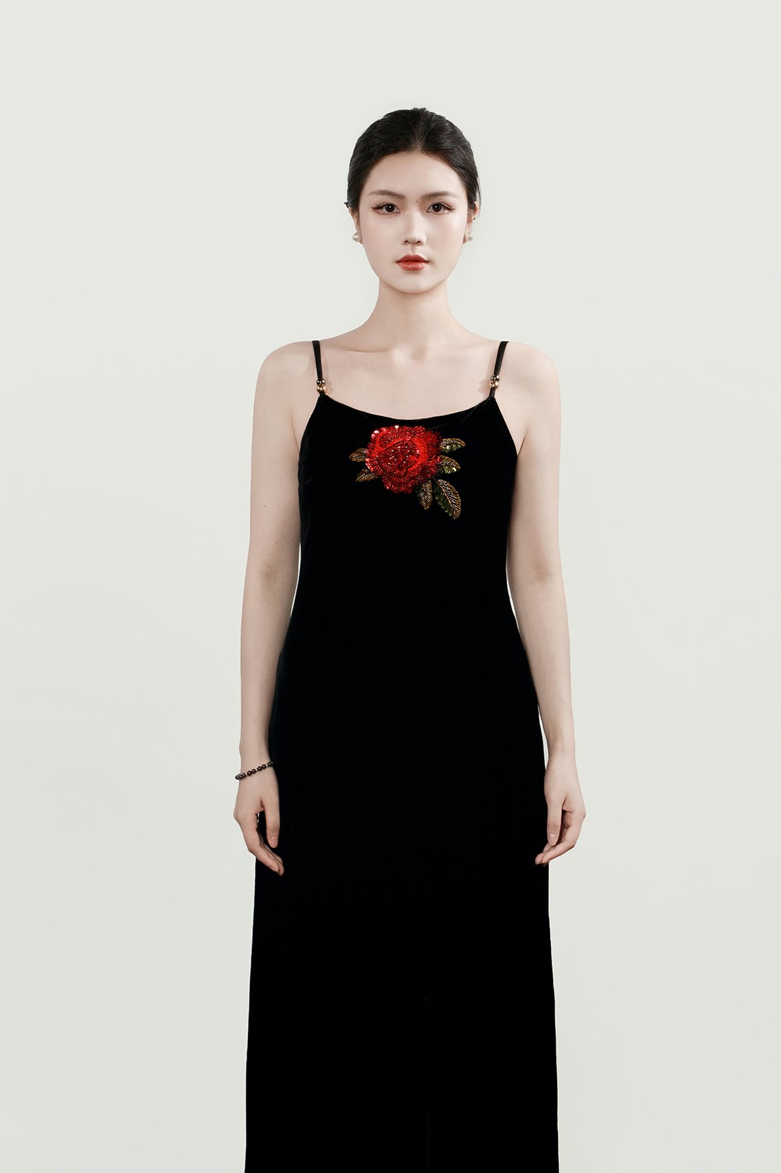 Sheng Tang Jing | Heavyweight Silk Velvet Rose Bead Embroidered Slimming Halter Dress