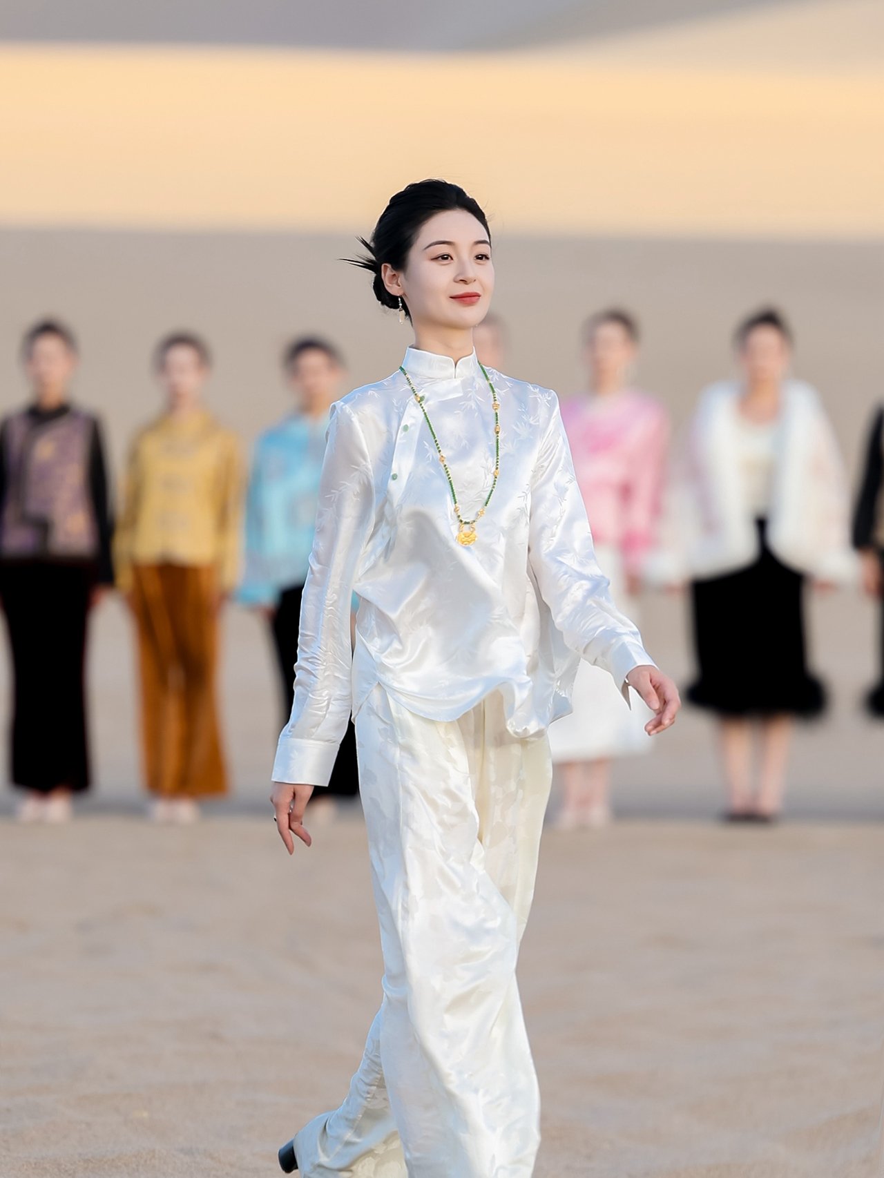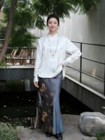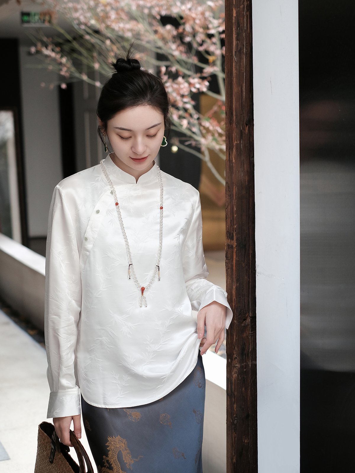 Sheng Tang Peony | Pearl White Silk Blouse with Bamboo Pattern and Asymmetric Collar