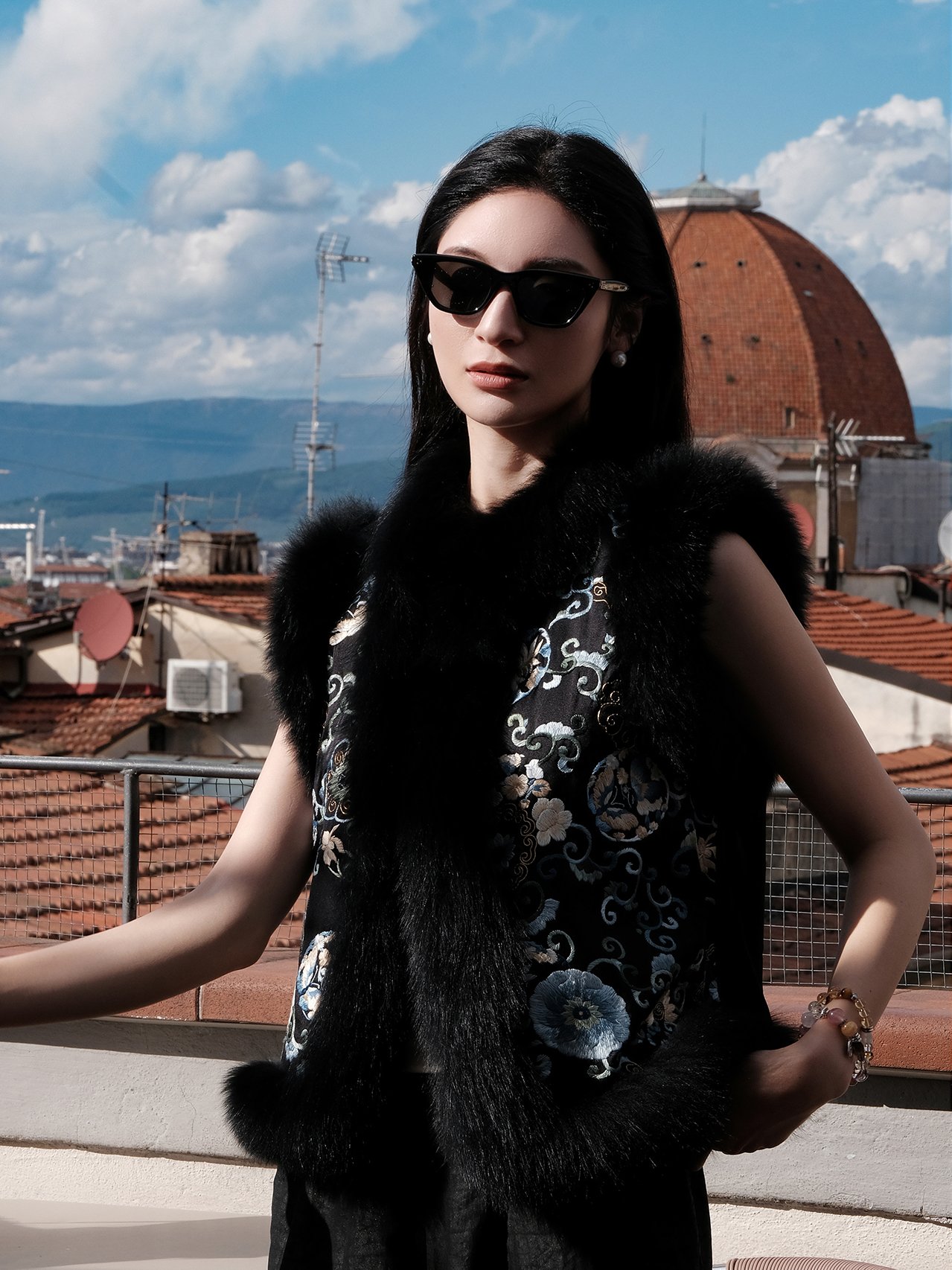 This piece conveys the auspicious symbolism of flourishing prosperity through the intangible cultural heritage of Suzhou-embroidered Bodhisattva Flowers. Set against an Ink Black silk base and accented with fluffy fox fur trim, it creates a visual texture of “understated luxury.” Suitable for winter indoor gatherings, year-end banquets, or daily wear, the fox fur detailing on the collar and cuffs offers both warmth and elevated elegance. It pairs seamlessly with modern Chinese-style outfits such as qipaos or wide-leg trousers. Every stitch embodies Eastern grace, allowing classical refinement to bloom quietly within contemporary attire—making it a timeless wardrobe heirloom to be cherished and passed down.