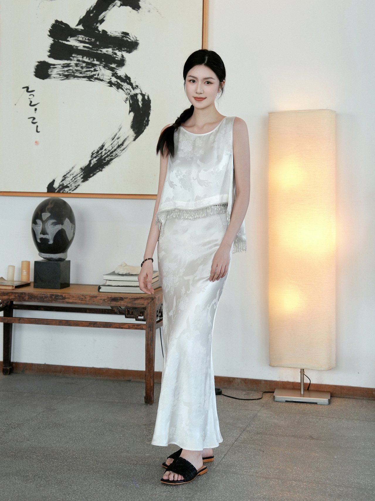 The ‘Four Gentlemen’ Guanle Crepe Midi Skirt is fashioned from a 40% silk and 60% rayon blend of Guanle Crepe. Against a Pearl White satin‑like ground, the motifs of plum blossom, orchid, bamboo, and chrysanthemum unfold gracefully. The skirt’s subtle fishtail silhouette, enhanced by the fabric’s natural drape, traces a line of flowing poetry—distilling a language that harmonizes Eastern auspicious aesthetics with modern minimalism. Designed for occasions that call for refined cultural expression, such as art collection viewings or thematic cultural dinners, it embodies a gentle, scholarly elegance that is both timeless and quietly compelling.